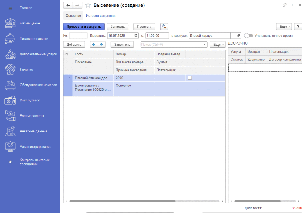 Документ «Выселение» фиксирует данные о выезде и окончательном расчете с клиентом. При этом номер становится «грязным», что отмечается в шахматке. Регистрация выселения также включает начисление задолженности за дополнительные услуги. Это необходимо, поскольку выселение осуществляется до проведения ночного аудита.