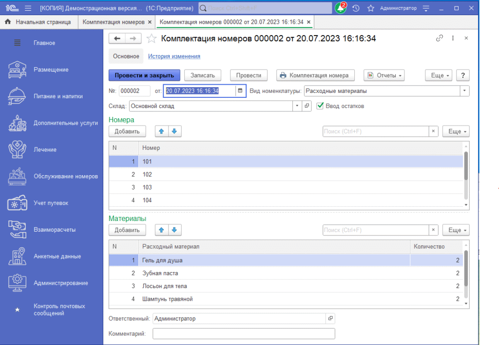 - Установка норм комплектации и замены — для каждой категории номера устанавливается количество расходных средств, которые должны в нем находиться, а также сроки их замены и особенности списания.