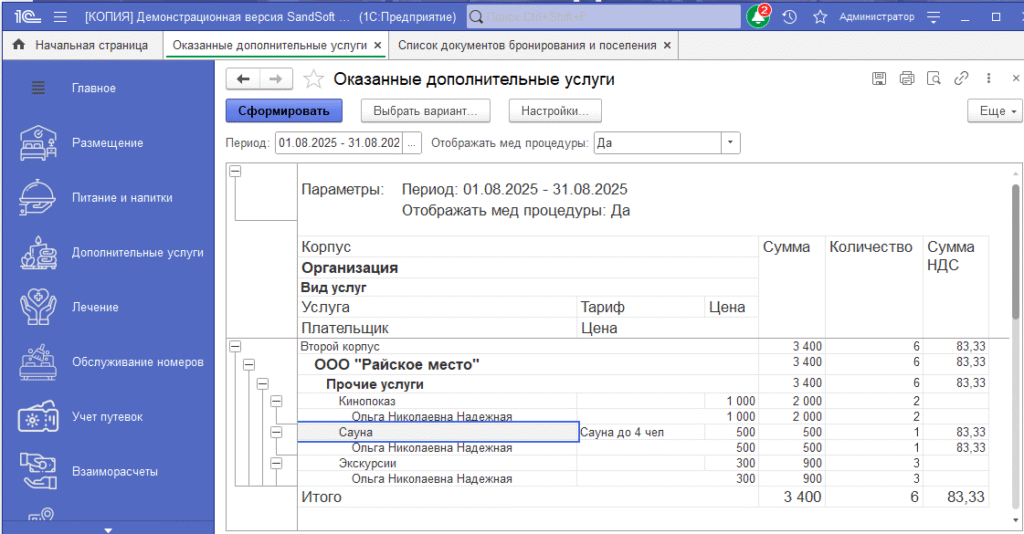 Пользователи имеют возможность выбрать подходящий период для формирования отчета. Нажимая кнопку «Сформировать», система предоставляет данные по всем оказанным дополнительным услугам. Таким образом, информация становится доступной в удобном формате. При этом, интерфейс обеспечивает возможность анализа данных за определенный период, что приносит дополнительное удобство.