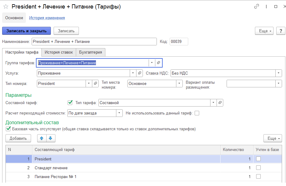 | ПРИМЕР: размещение гостя по путевки предусматривает три вида услуг: проживание в номере категории «President», питание и лечение. При этом считается, что стоимость 3-разового питания для одного человека составляет 300 руб./сутки, стоимость лечения – 900 руб./сутки. Само же размещение в номере категории «President» стоит 1000 руб./сутки. Создается составной тариф «Путевка «President» для услуги Проживание. В его состав его дополнительной части включаются тарифы «Комплексное питание» и «Лечение», созданные для услуг Питание и Лечение соответственно. Для тарифов «Комплексное питание» и «Лечение» устанавливаются ставки 300 руб. и 900 руб. Для тарифа «Путевка «President» устанавливается ставка 1000 руб. Таким образом, стоимость одних суток размещения по путевке составит 2 200 руб., где 1 000 руб. – это базовая часть тарифа (стоимость его базовой услуги, в данном случае – проживания в номере), и 1 200 – дополнительная часть, т.е. стоимость прочих услуг, входящих в путевку. |